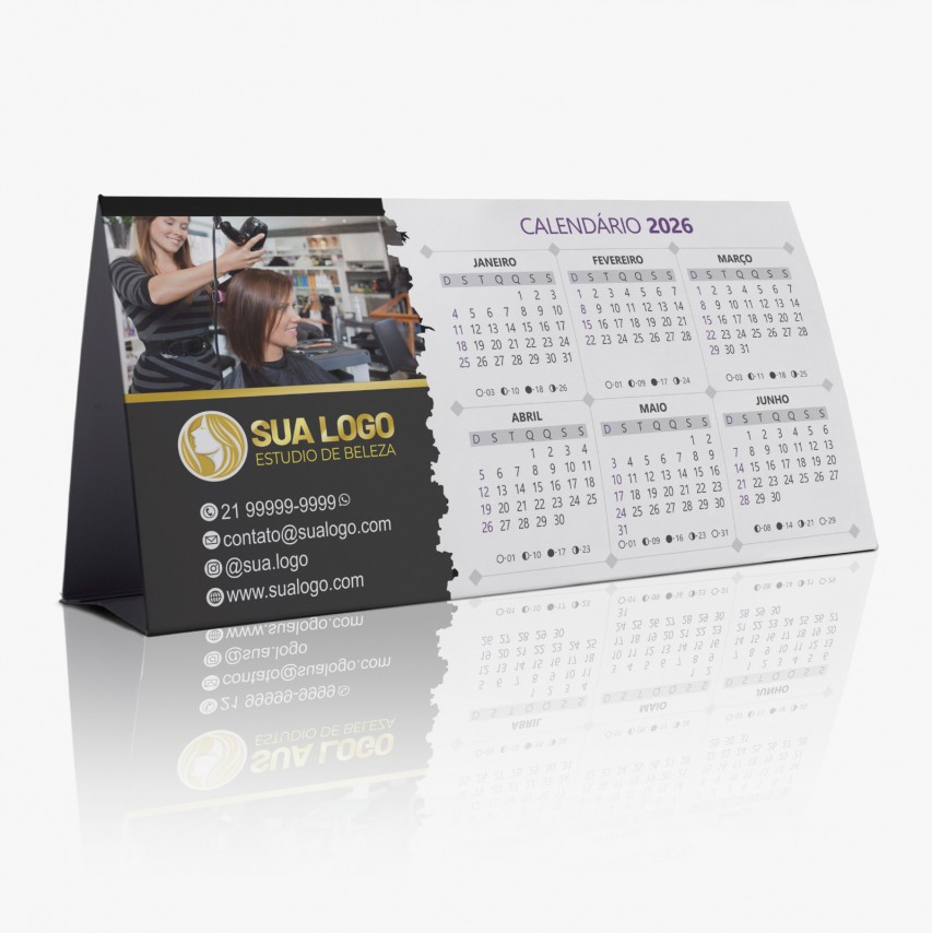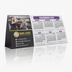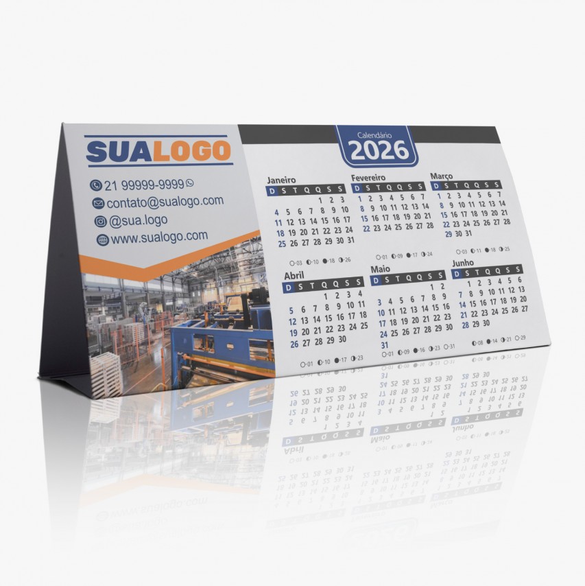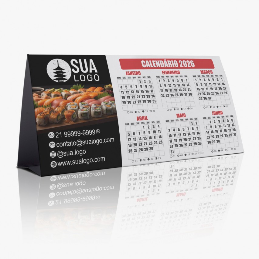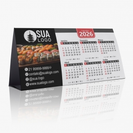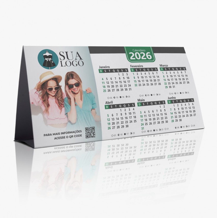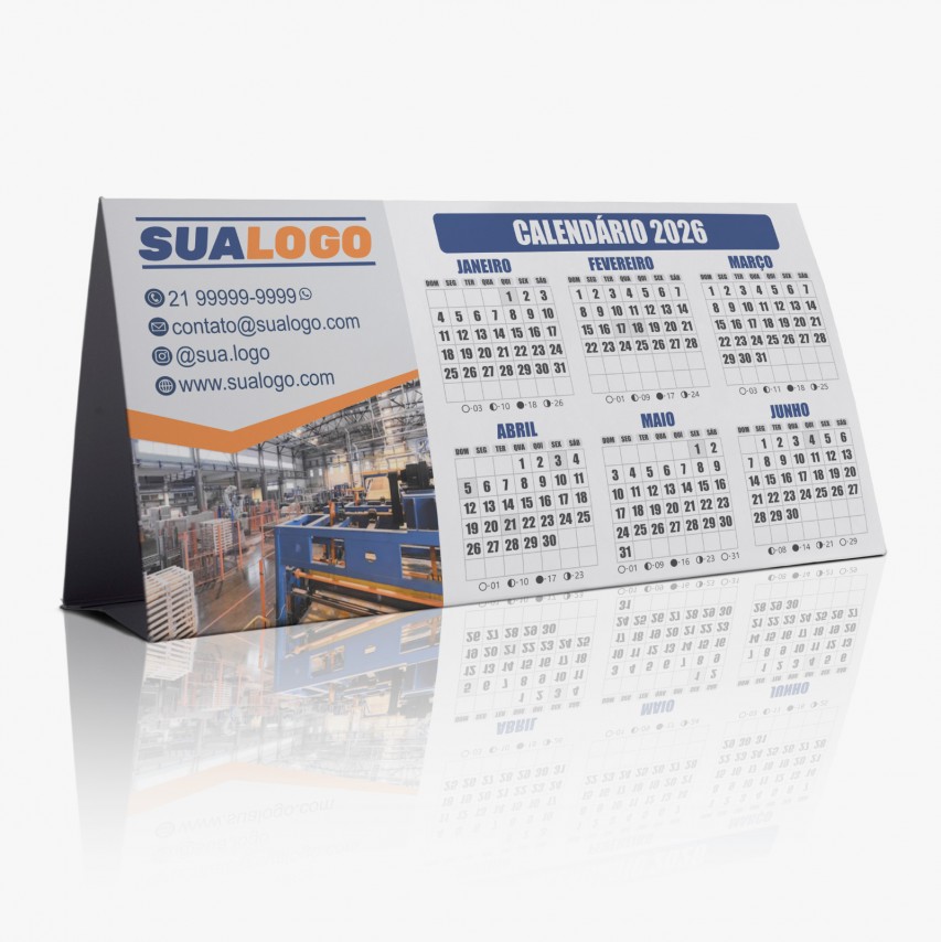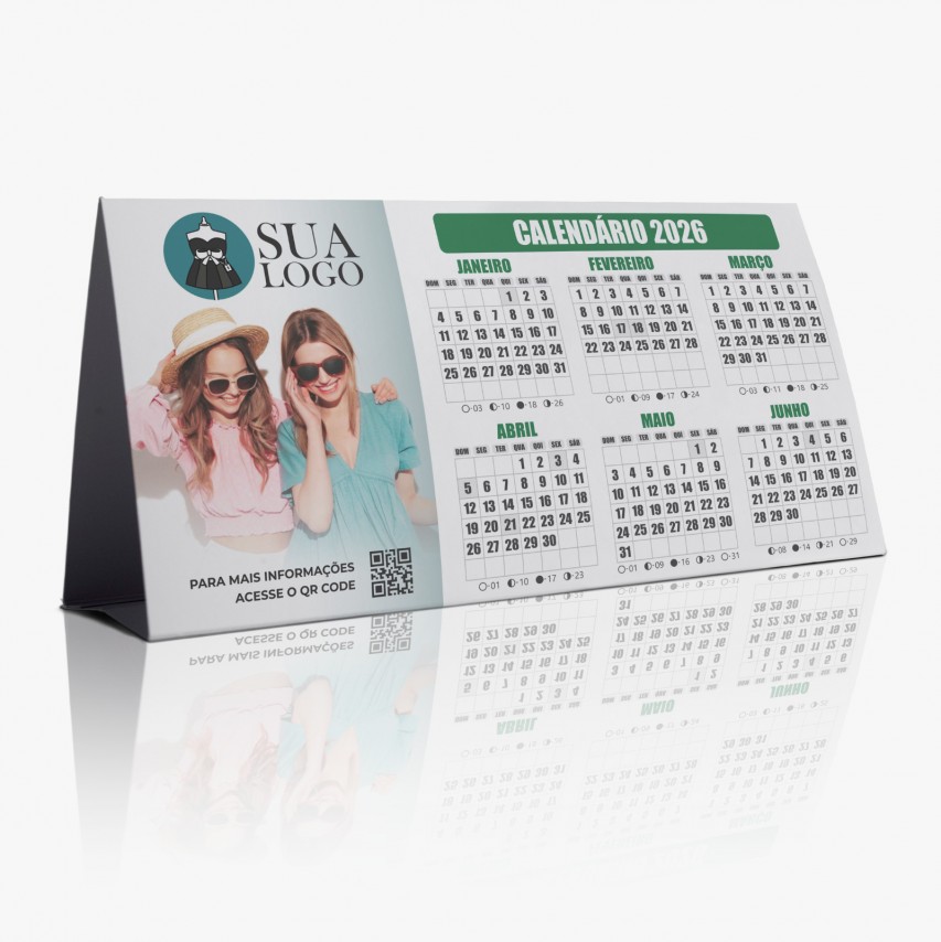 Calendário de mesa com 6 meses em cada lado e espaço para personalização.